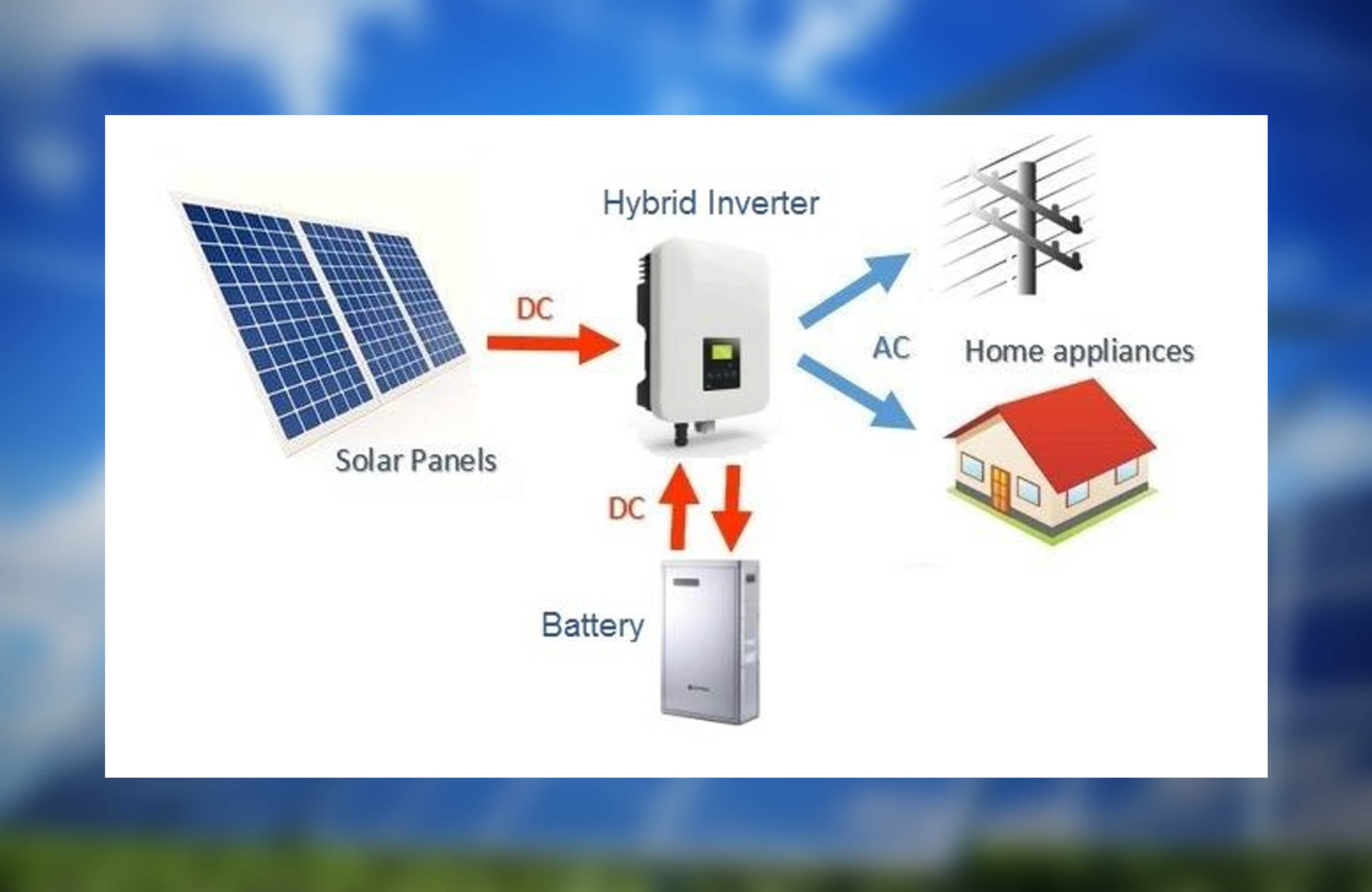 Hybrid solar system is a combination of both above said solar system. It uses a collection of solar batteries that can interact with the main power grid. As a result, it reduces your electricity bill significantly and returns more than it costs over a while. We can say that, On Grid Solar System + Off Grid Solar System = Hybrid solar system. Depending on how your hybrid system is set up and whether your utility allows it, once your batteries are fully charged excess solar power not required by your appliances can be exported to the grid via your meter. When your solar system is not in use, and if you have drained the usable power in your batteries your appliances will then start drawing power from the grid.